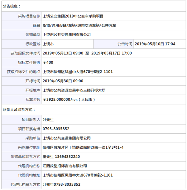 江西政岳招标咨询有限公司关于上饶公交集团2019年公交车采购项目(招标编号:JXZY-2019018)公开招标公告