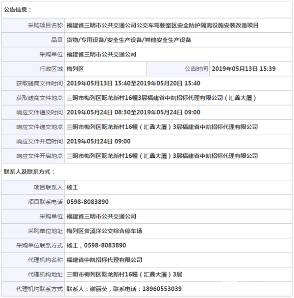 福建省三明市公交公司公交车驾驶室区安全防护隔离设施安装改造项目磋商
