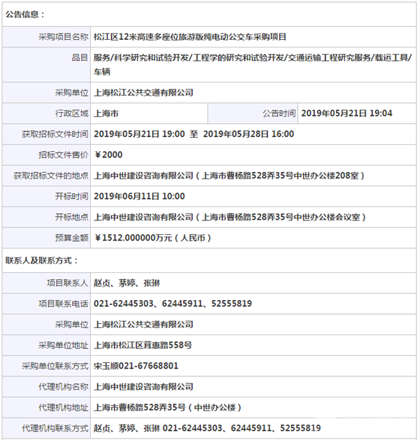 上海市松江区12米高速多座位旅游版纯电动公交车采购项目招标公告