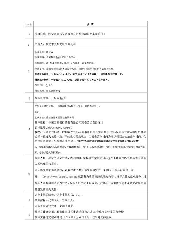 1、项目名称:雅安市公共交通有限公司纯电动公交车采购项目