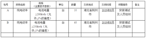 2.2招标内容: 纯电动车,交货地点为湖北省荆州市,交货时间预计为2019年8月,分为A、B,2个标包 (说明货物名称、标包划分、交货地点、交货时间等)。