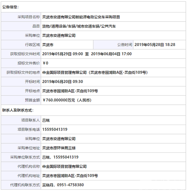 宁夏灵武交通有限公司新能源电动公交车采购项目公开招标公告