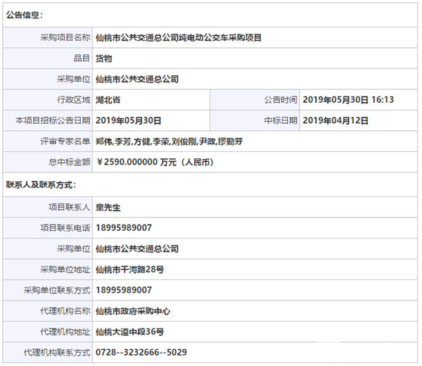 湖北省仙桃市公共交通总公司纯电动公交车采购项目中标公告
