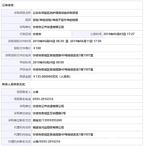 福建宁德公交公司公交车驾驶区防护隔离设施采购项目招标公告