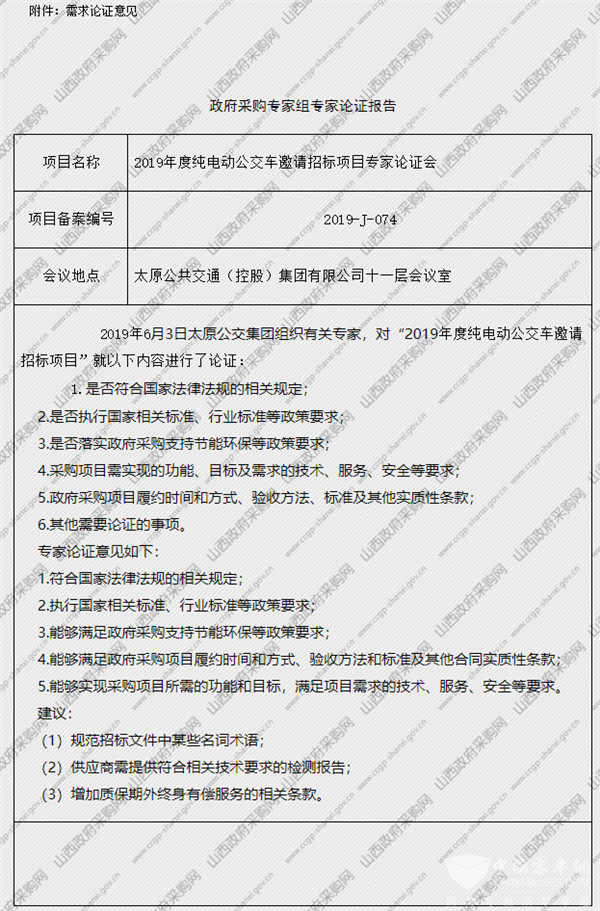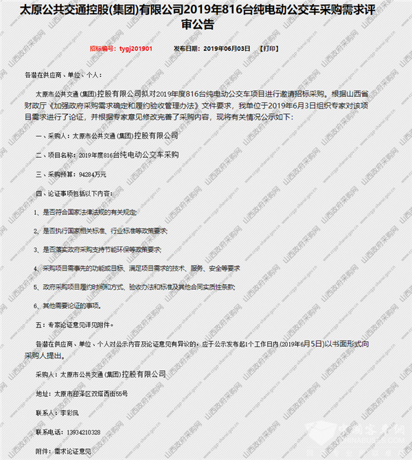 山西太原公交公司2019年816台纯电动公交车采购需求评审公告