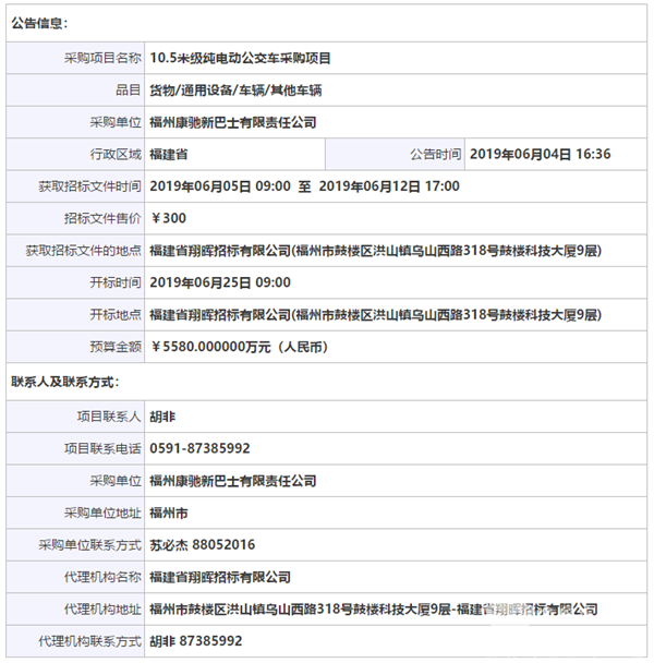 福州康驰新巴士有限责任公司10.5米级纯电动公交车采购项目公开招标公告