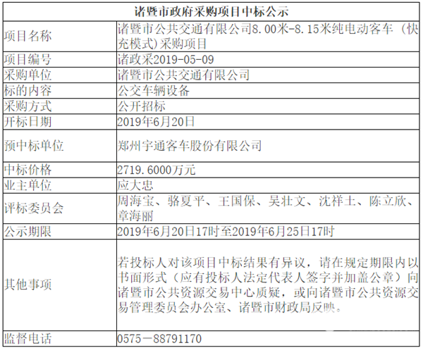 浙江省诸暨市公交公司8.00米-8.15米纯电动客车采购项目中标公告