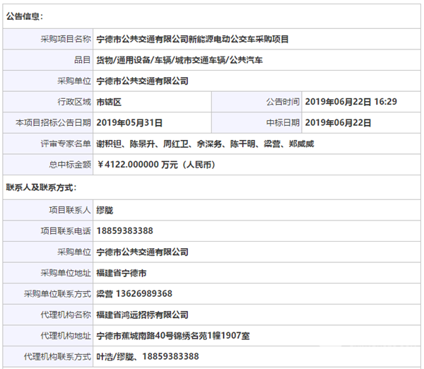 福建省宁德市公交公司新能源电动公交车采购项目中标公告