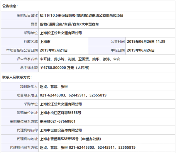 上海松江公交公司松江区10.5米级超高级纯电动公交车采购项目中标公告