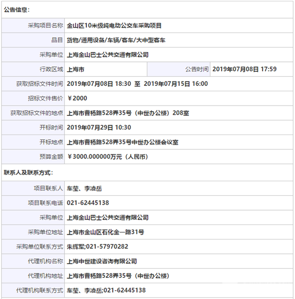 上海市金山区10米级纯电动公交车采购项目公开招标公告