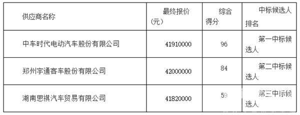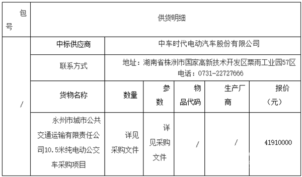 湖南省永州市城市公交运输公司10.5米纯电动公交车采购中标公示