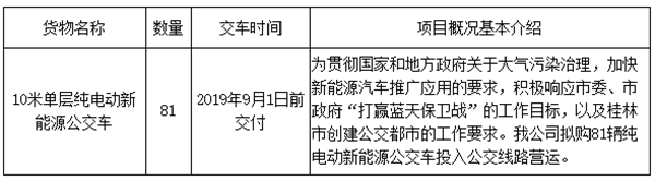 桂林建银工程造价咨询有限公司受 桂林市公共交通集团有限公司 的委托,根据《中华人民共和国政府采购法》、《中华人民共和国政府采购法实施条例》及财政部令第87号《政府采购货物和服务招标投标管理办法》等规定,于2019年7月29日就 纯电动新能源公交车第二批采购 采用公开招标方式进行采购,现就本次招标的成交结果公告如下: