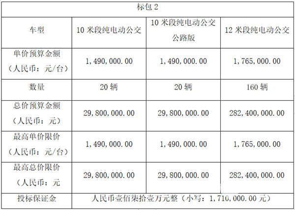 10米段纯电动公交公路版投标单价:¥1,490,000.00