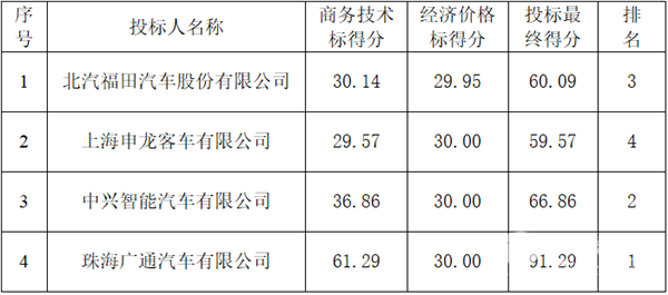 受珠海公交巴士有限公司的委托,广东时代华启招标有限公司于2019年8月8日就珠海公交巴士有限公司2019年新增500辆纯电动公交车购置项目(招标编号:1900257C)采用公开招标进行采购。经评标委员会评审,并经招标人确认,现就本次采购的中标结果公示如下: