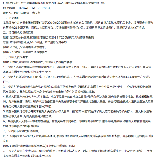 湖北省武汉市公交公司2019年200辆纯电动城市客车采购招标公告
