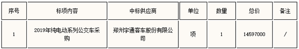 浙江省仙居县公交公司2019年纯电动系列公交车采购中标结果公告