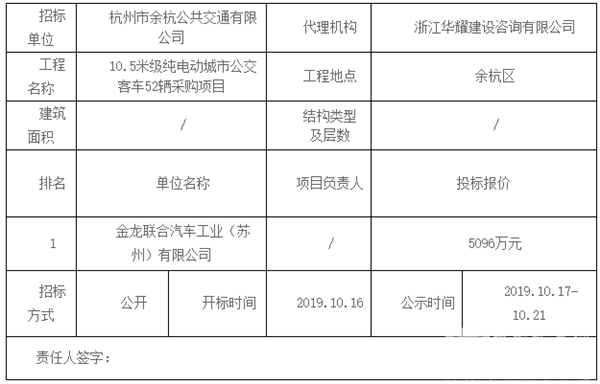 浙江杭州余杭公交公司10.5米级纯电动公交车52辆采购项目拟中标公示