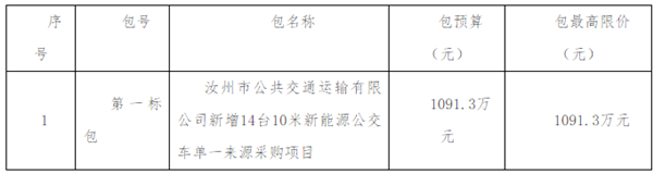 1、采购内容:汝州市公共交通运输有限公司新增14台10米新能源公交车;