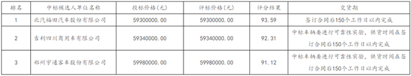 全部投标单位:吉利四川商用车有限公司,郑州宇通客车股份有限公司,中通客车控股股份有限公司,北汽福田汽车股份有限公司,南京金龙客车制造有限公司,广西申龙汽车制造有限公司