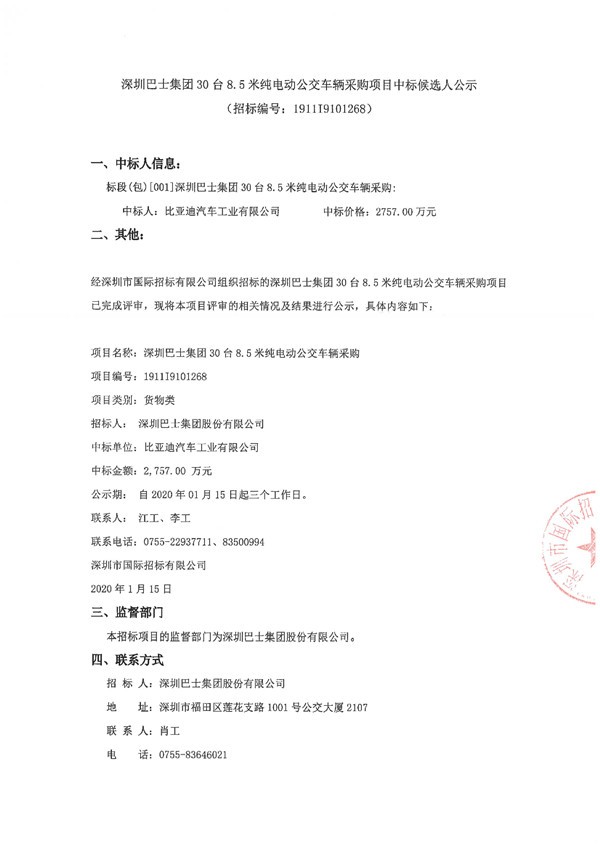 - 深圳巴士集团发布100辆10.5米低地板纯电动公交车采购招标公告