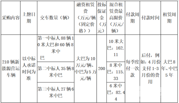1、本批新能源车辆设一个标的,采用一次报价方式,以“综合得分高者中标”的原则,选定三家中标单位。其中第一中标人中标88辆10米大巴和60辆8米中巴,第二中标人中标35辆8米中巴,第三中标人中标27辆6米中巴。投标人必须同时对210辆新能源车辆进行投标,只对部分车辆投标的将不被接受。
