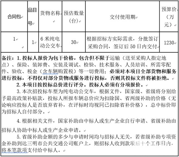 福建省三明市公共交通公司6米纯电动公交车采购项目招标公告