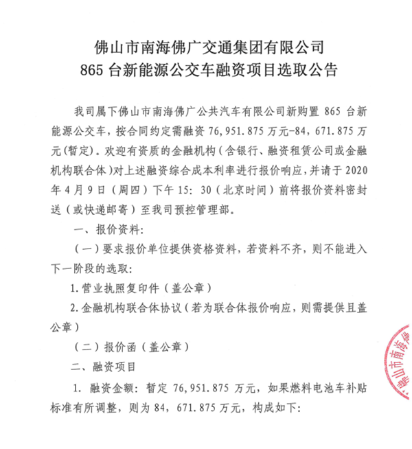 广东佛山南海佛广交通集团有限公司865台新能源公交车融资项目选取公告