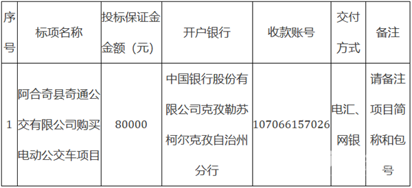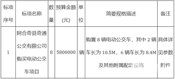 新疆克孜勒苏州阿合奇县奇通公交公司购买电动公交车项目公开招标公告