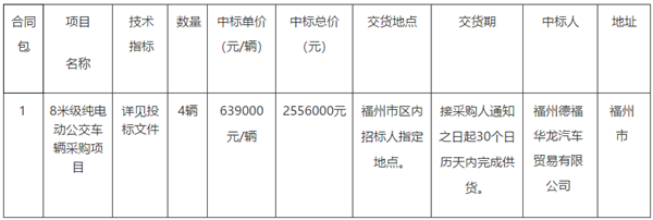 福建省福州华威公交巴士有限公司8米级纯电动公交车辆采购项目中标公告