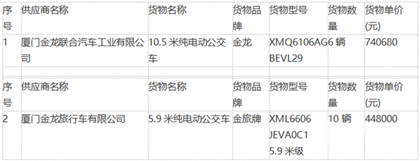 1、合同包1中标人:厦门金龙联合汽车工业有限公司;合同包2中标人:厦门金龙旅行车有限公司。