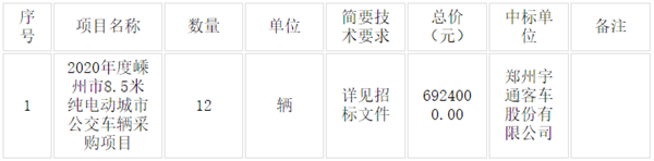 浙江省嵊州市公交公司2020年度嵊州市纯电动城市公交车辆采购招标公告