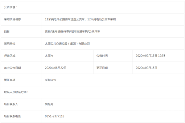 山西省太原市公交公司11米纯电动公交车、12米纯电动公交车采购更正公告