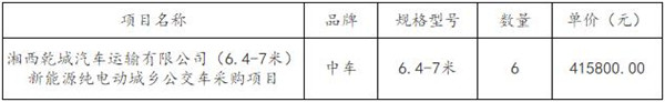 二、项目名称:湘西乾城汽车运输有限公司(6.4-7米)新能源纯电动城乡公交车采购项目