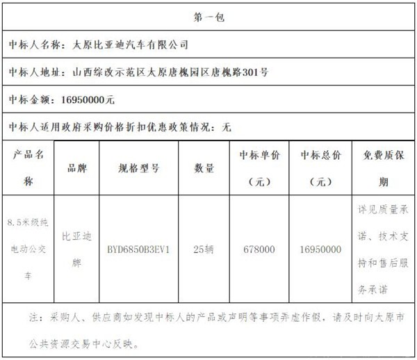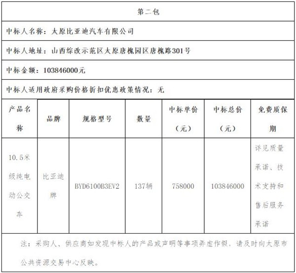 山西省太原市公交公司关于纯电动公交车公开招标采购的中标公告
