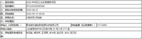青岛市交通运输局2020年市区公交车辆更新项目中标公告