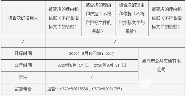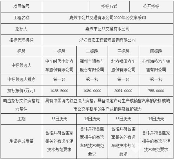 浙江省嘉兴市公共交通有限公司2020年公交车采购中标候选公示
