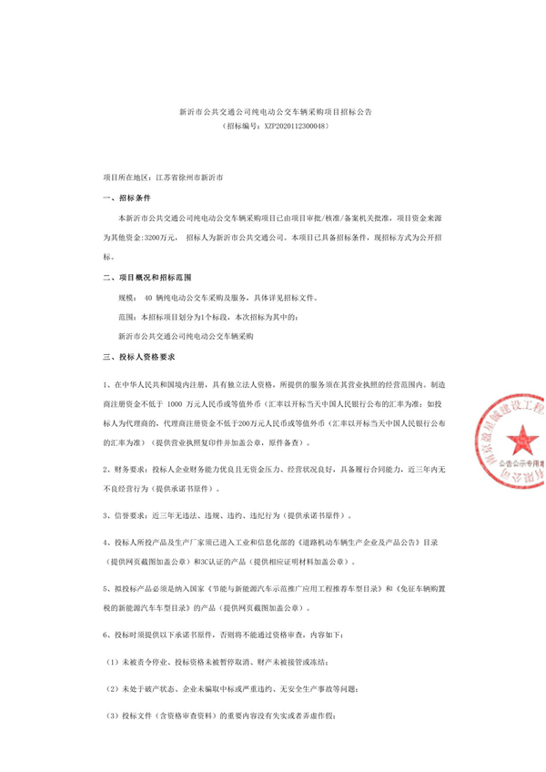 - 广西贵港市公交公司购置100辆新能源公交车项目中标公告