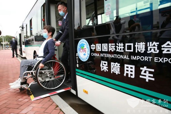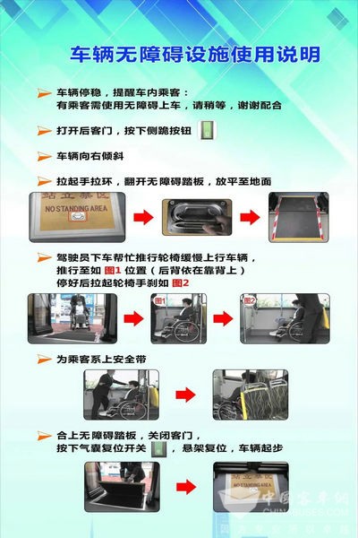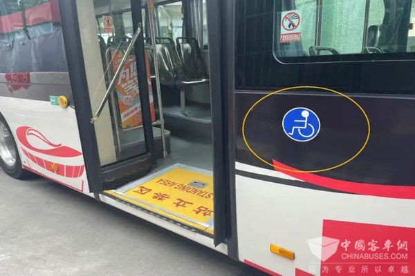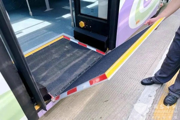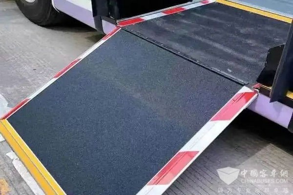 无障碍公交车采用一级踏步,车辆中门设置有上下车活动翻板,方便轮椅车通行,并设置了独立的固定停放区域。
