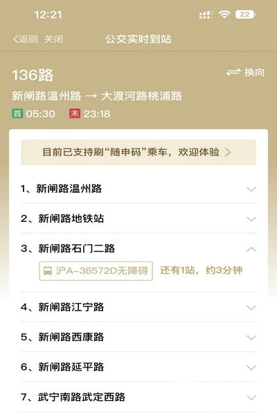 乘客可通过手机“随申办”App上的“公交到站查询”模块了解无障碍公交车到站信息。比如输入要乘坐的线路名称136路,点击上车站点后即可显示“车牌号+无障碍+距离还有几站,约几分钟到达”等的信息。