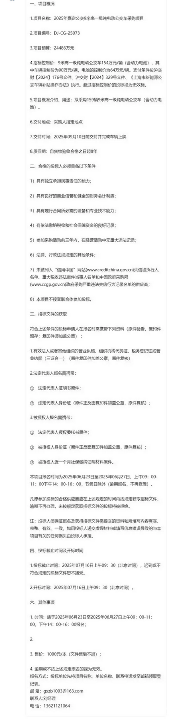 2025年嘉定公交9米高一级纯电动公交车采购项目