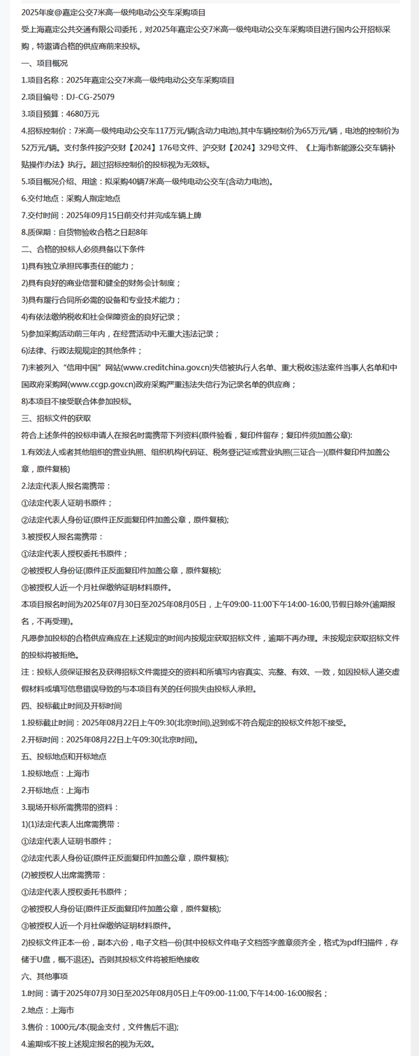 2025年嘉定公交7米高一级纯电动公交车采购项目招标公告