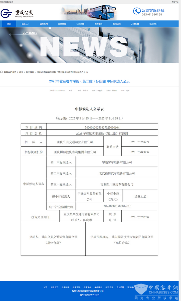 - 中标近7.1个亿!重庆公交集团发布938辆公交车采购中标公告