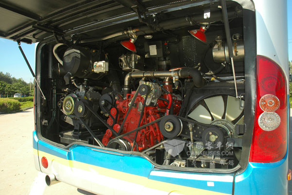 中通新能源客车后置发动机舱里同时布置了康明斯发动机和电动机,油电动力合理搭配,动力充沛的同时力求节能减排。