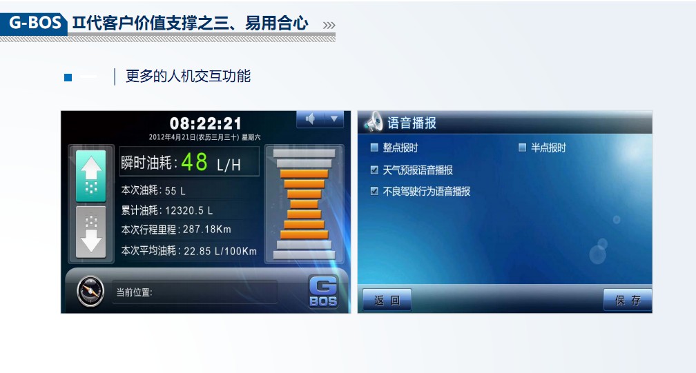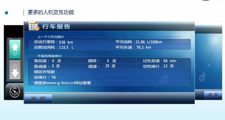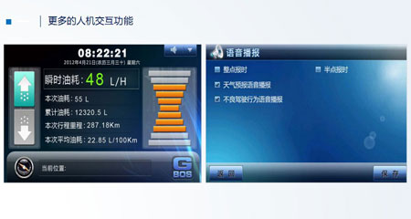 智能,实时人机沟通。驾驶员操作的即时语音提醒,隔日终端开机时显示的更多运行信息,让人机互动中实时提升操作水平。