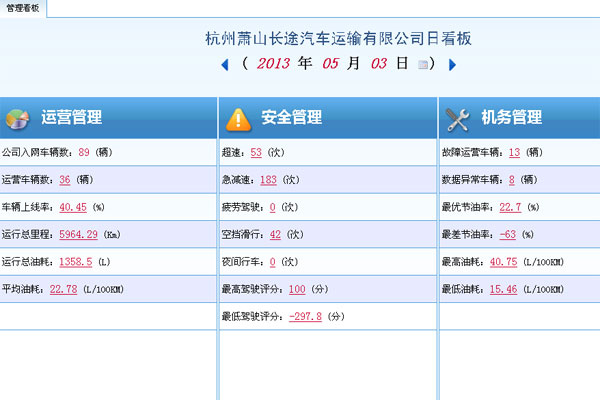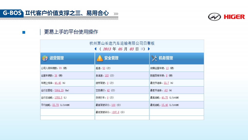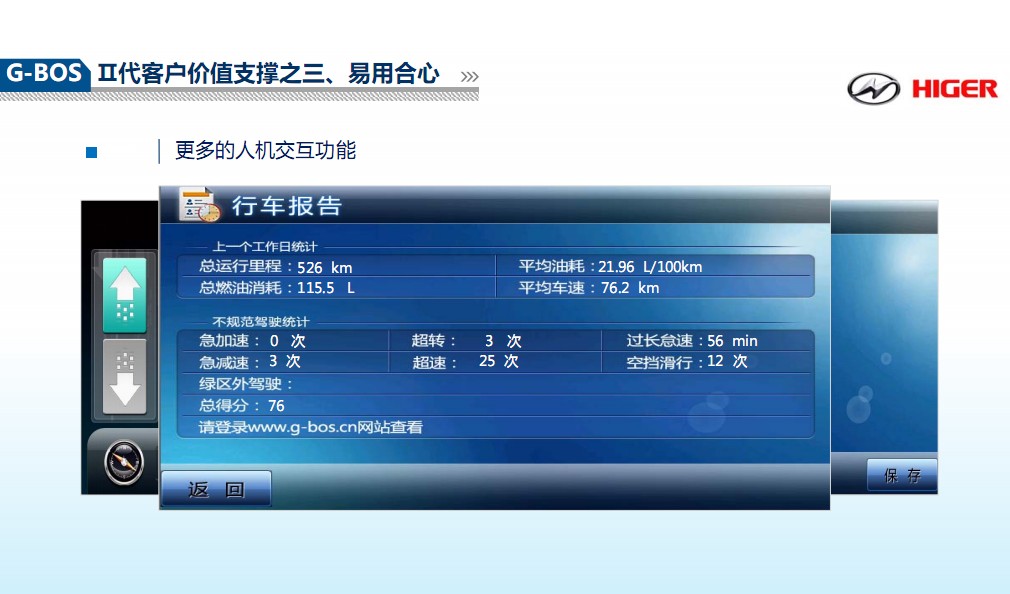 G-BOS的强大不仅在于为管理者提供了真实、详细的数据,更在于为驾驶员在外的驾驶行为提供了规范。这不仅有助于客运安全,更是降低了运营成本。胡总解释说:“我们之前有一个司机,我们通过G-BOS的异常数据重点观察,发现他开的车刹车、点火系统维修的频率比其他车高很多,换其他人开这辆车就不会坏得这么频繁,换他去开其他车也是很容易损耗。后来综合数据考量,发现是他的驾驶行为不好,我们对其进行了严格的再培训。”