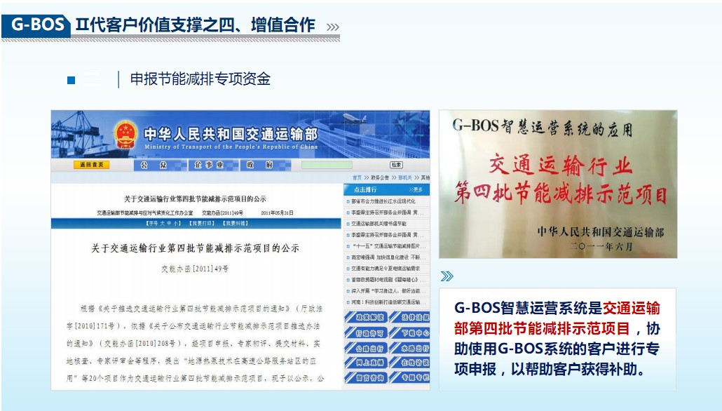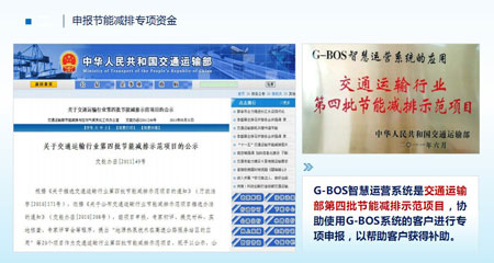 协助申报节能减排专项资金。G-BOS为交通运输部第四批节能减排示范项目,我们将协助客户成功申报专项,以获取更多资助。
