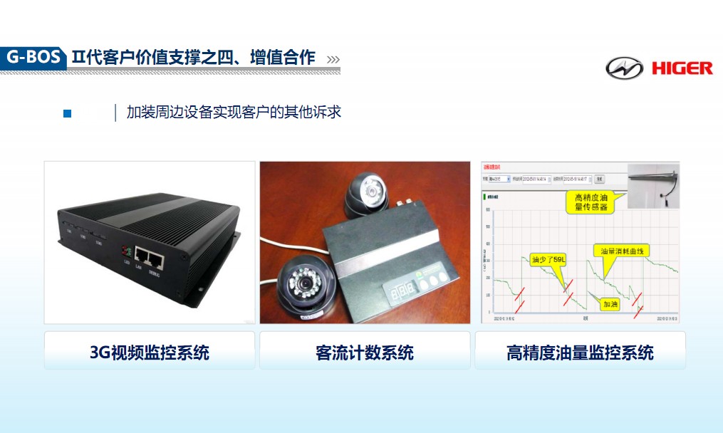 增值合作。按需加装更多周边设备,实现多样功能诉求。如3G视频录像、高精度油量传感器、道路偏移系统(LDWS)、汽车自动防撞系统、360°全景环视系统、抬头显示系统(HUD)等。