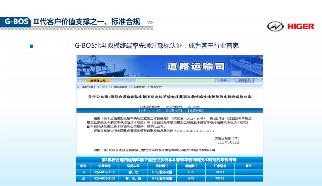北斗终端率先通过部标。G-BOS北斗双模终端率先通过部标认证,成为客车行业业内首家。