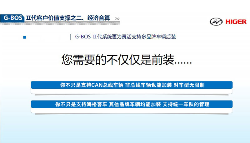 灵活扩展,支持多品牌车辆后装。无车型限制,CAN总线、非总线车辆都可加装;无品牌要求,海格与其它品牌车辆均能加装。