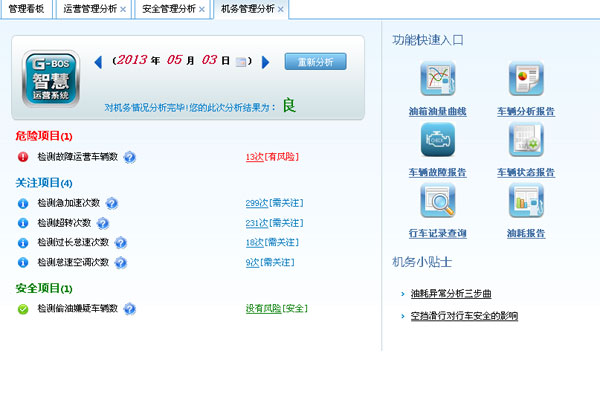 徐州公路G-BOS使用报告: 徐州公路运输集团目前装有G-BOS车辆223台。自从2011年6月加装第一批G-BOS以来,到现在管理上以G-BOS作为管理工具,在整个苏北客运行业取得较大成功和较好的经济效益。2012年12月1-20号整个集团经过一年的运行,增加了40多台G-BOS车辆,且都是10米以上的大型豪华车辆。G-BOS车的保有量已经到了223台。行驶里程1415642公里,燃油消耗是275280升,单车油耗在19.44升/百公里。和去年同期相比,单车油耗下降0.66升/百公里。按照这些装有G-BOS的车辆2012年全年实际行驶26685755公里测算,节约燃油:26685755/100*0.66=176125升,折合现金123万元。